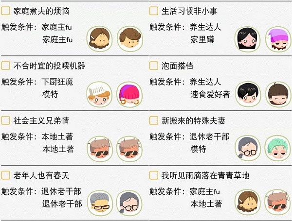 2、这8种搭配方法是:①家庭主fu(女) 家庭主fu(男)触发“家庭煮夫的烦恼”;②下厨狂魔(男) 模特(女)触发“不合时宜的投喂机器”;③本地土著(男) 本地土著(男)触发“社会主义兄弟情”;④退休老干部(男) 退休老干部(女)触发“老年人也有春天”;⑤养生达人(女) 家里蹲(女)触发“生活习惯非小事”;⑥养生达人(男) 速食爱好者(女)触发“泡面搭档”;⑦;退休老干部(女) 模特(男)触发“新搬来的特殊夫妻”;⑧家庭主fu(女) 本地土著(男)=我听见雨滴落在青青草地。