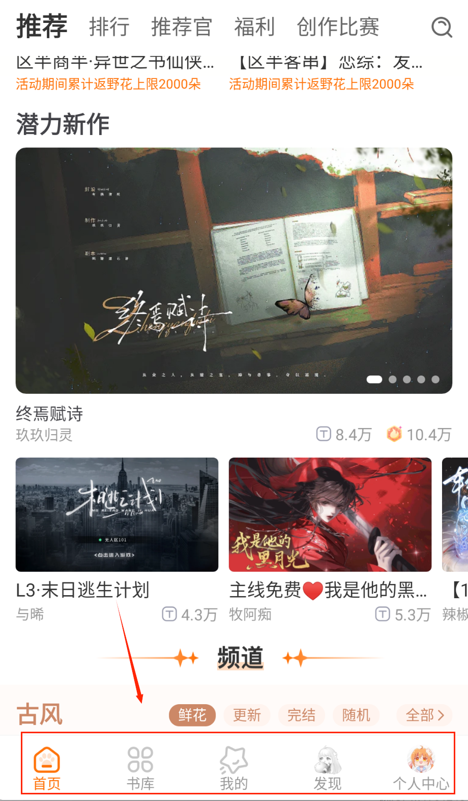 1、底部导航栏提供五个主要功能入口,首页展示推荐内容,书库集中作品资源,我的管理个人数据,发现提供互动社区,个人中心进行设置。
