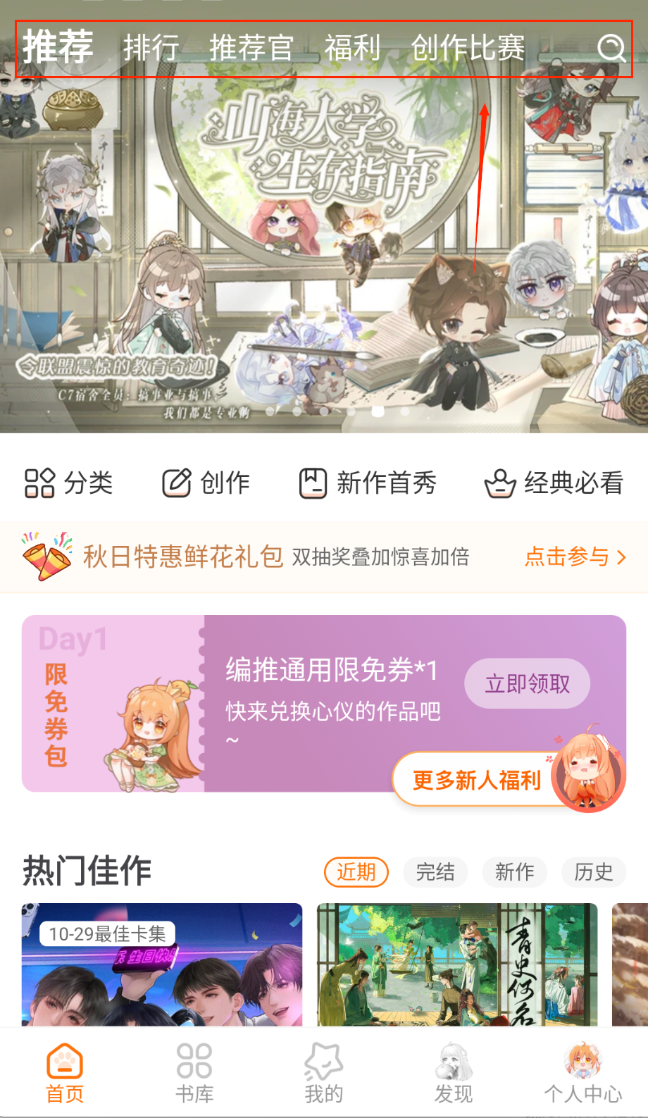 2、首页顶部导航栏可以切换不同内容板块,包括推荐、排行、推荐官等选项,每个板块呈现特定类型的内容集合。