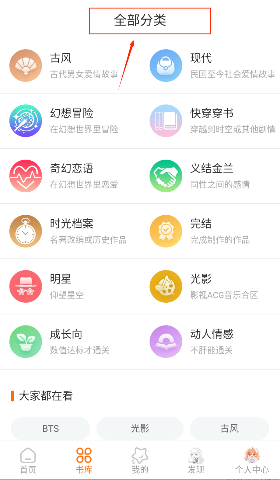 1、使用书库页面的分类筛选功能,十六个分类标签涵盖古风、现代、奇幻恋语等不同题材,每个分类都有详细说明,帮助快速定位喜好内容。