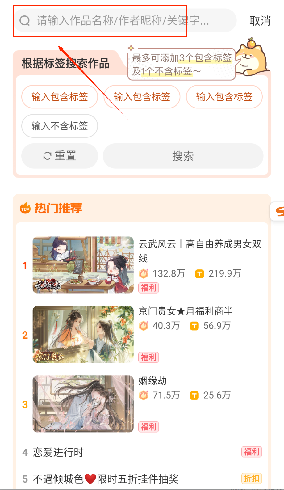 2、在搜索界面输入关键词查找特定作品,支持作品名称、作者或角色名等搜索条件,搜索结果会按相关度排序显示作品封面和简介信息。