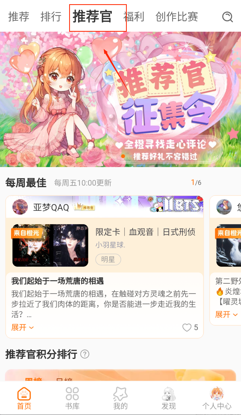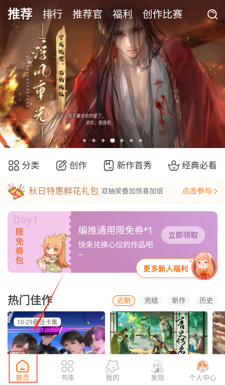 3、关注首页推荐的热门佳作区域,这里展示近期、完结、新作等不同标签的作品,可以按更新时间或人气值进行排序筛选。