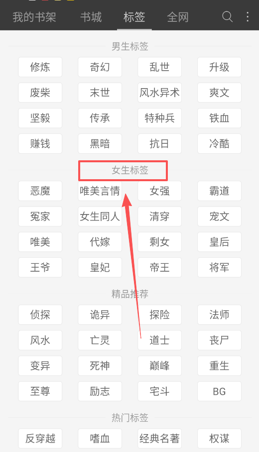 2、标签系统尤为细致,除男女频道外,还有精品推荐与热门标签,涵盖“权谋”“丧尸”“宠文”等多元题材,便于垂直搜索。