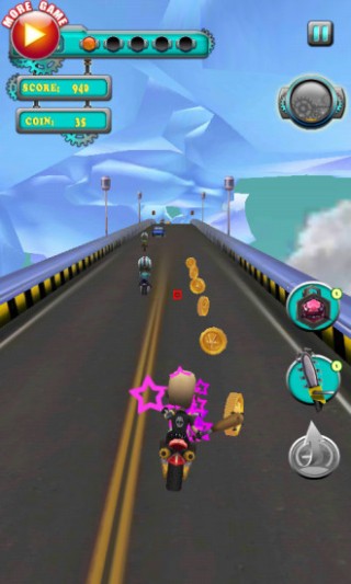 《极速摩托3D》是一款有趣的摩托赛车游戏。游戏逼真模拟,设置多种场景和障碍,是真正摩托爱好者的最佳选择。游戏中玩家控制一辆摩托在公路上高速行驶,玩家要避免摩托撞到其它车辆的同时尽量多收集沿途的金币。金币可用来购买更高级的摩托。对自己的摩托驾驶技术有信心吗?快来挑战一下吧!