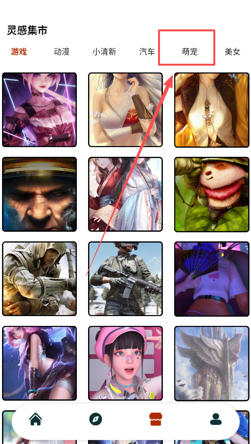 1、刚开始用不用想得太复杂,先在灵感集市里随便点开几个好看的分类和图片,比如萌宠或者风景,找找感觉。