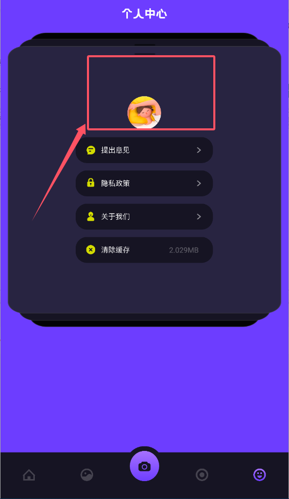 1、进个人中心在底部导航栏找相机图标,里面能提意见或清缓存,头像下方功能列着很清楚呢。
