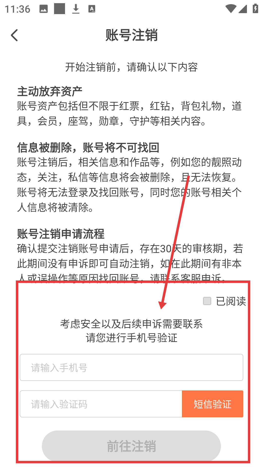 4、在账号注销界面填写手机号、验证码,完成验证后可继续注销账号流程啦。