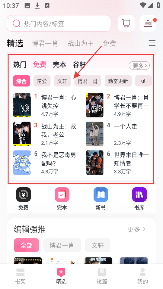 1、在软件精选页面,可选择热门、免费等分类及各类标签,查看对应书籍列表,找到心仪书籍啦。