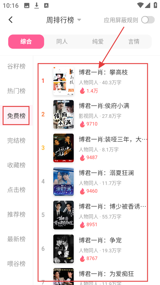 2、在排行榜页面选择【免费榜】,就能看到免费小说的排名情况,挑选喜欢的小说啦。