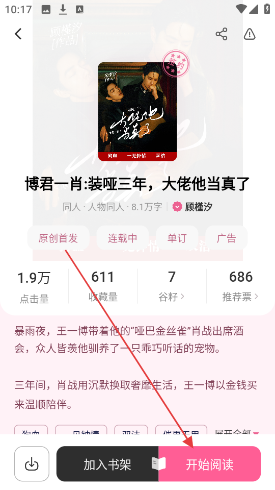 3、进入小说详情页后,点击【开始阅读】,就能开启小说的阅读之旅哦。