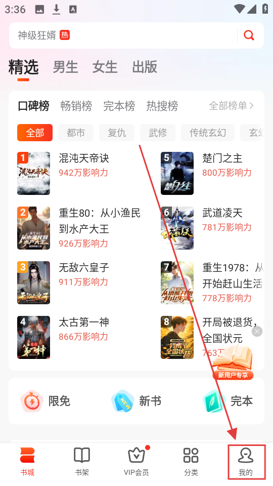 1、进入软件,有精选榜单的小说,若想管理个人阅读相关,就点击右下角【我的】按钮吧。