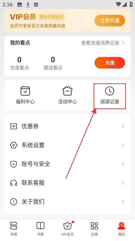 2、到【我的】页面,里面有好多功能,想查看之前读的小说,就点击【阅读记录】选项。