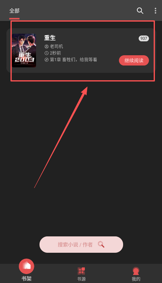 2、第二步是搜索书籍,返回首页的“书架”,使用顶部的搜索功能,输入书名,即可从已启用的书源中快速找到你想看的那一本。