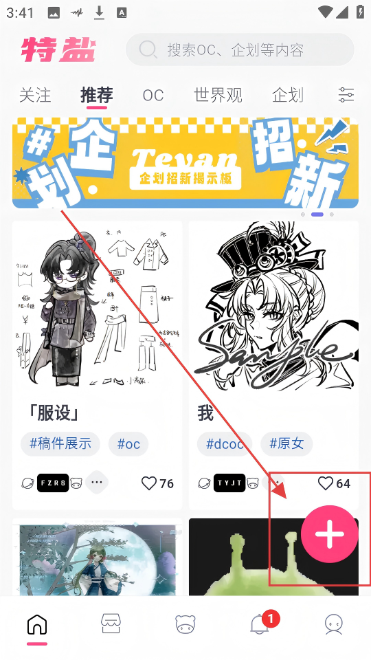 1、在特盐首页,点击右下角粉色加号按钮,就能展开创作选项,开启OC创建之旅啦。