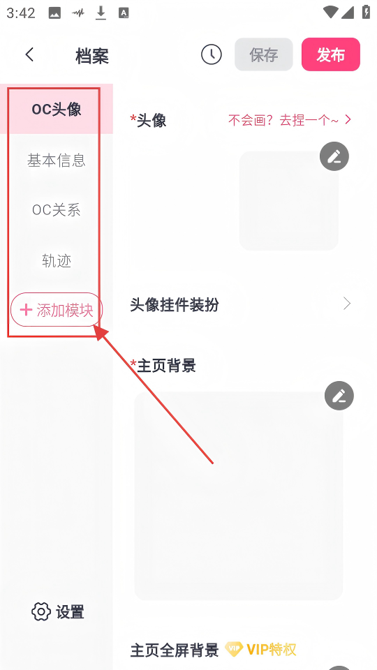 3、进入后,在档案页面左侧,点击【+添加模块】按钮,就能展开模块选择框啦。