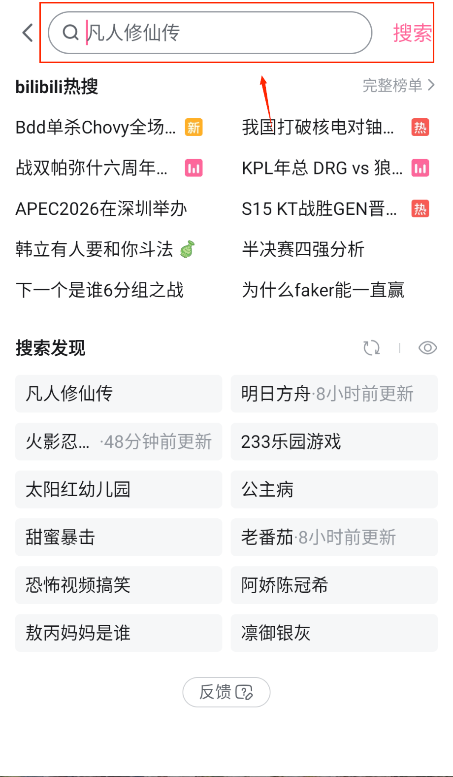 2、通过顶部搜索栏输入关键词查找特定内容,比如动漫名称或UP主名字,搜索结果会按相关度排序显示。