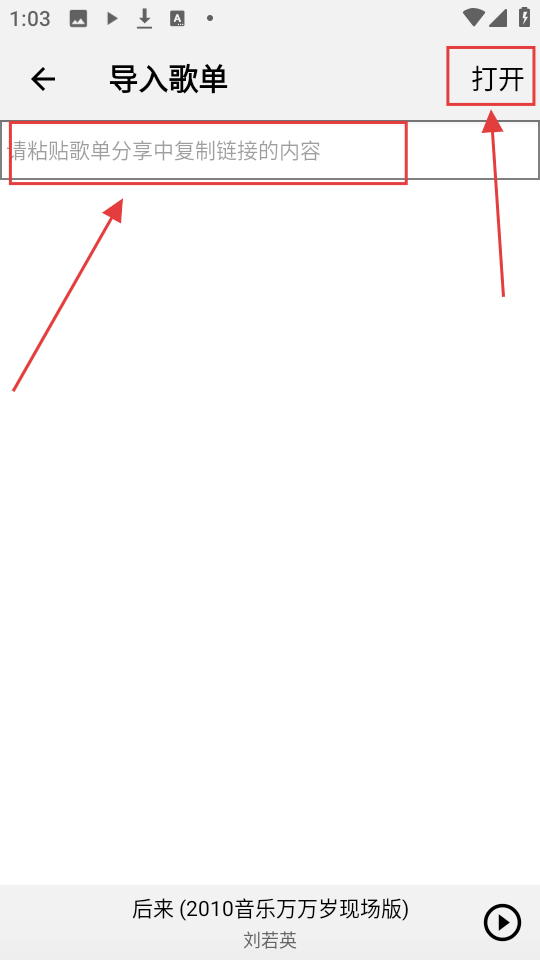 4、进入导入歌单页面,在输入框粘贴歌单链接,再点击【打开】,就能导入外部歌单啦。
