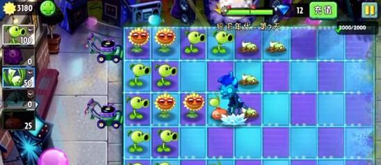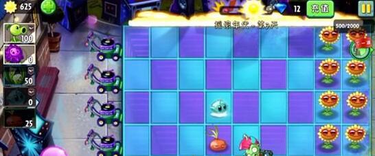 3、先别急着消灭他们喔,让他们把向日葵踢到我们安全的后方再干掉他们!大丽菊、冰冻生菜、眩晕洋葱,都是很好的减速控制植物。