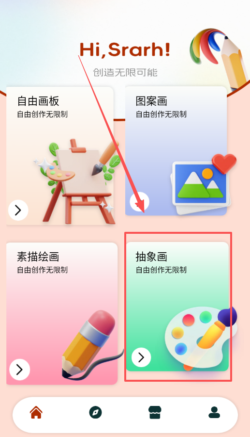 2、根据构思特点选择创作界面,抽象构思可选“抽象画”,具象创作可选“素描绘画”或“自由画板”。