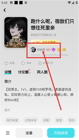 2、进入作品详情页后,点击作者名【虾虾呀】区域,可进入该作者的个人主页,查看其更多作品哦。