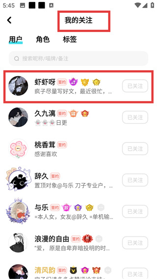 4、进入【我的关注】页面,能看到已关注的作者列表(包括刚关注的【虾虾呀】),方便管理关注对象咯。