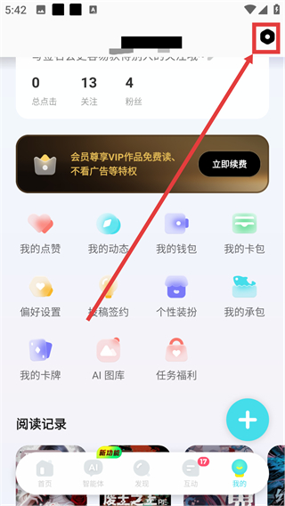 1、在【我的】页面找到右上角的设置图标,点击它就能进入设置界面,这里能调整各类功能选项哦。