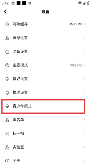2、进入设置页面后,找到【青少年模式】选项并点击,就能进入该模式的设置界面啦。