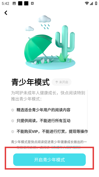 3、在【青少年模式】页面,点击底部的【开启青少年模式】按钮,就能进入后续的设置步骤啦。