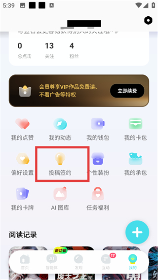 2、在个人中心页面点【投稿签约】选项,进入投稿相关界面,可查看投稿的要求和权益啦。