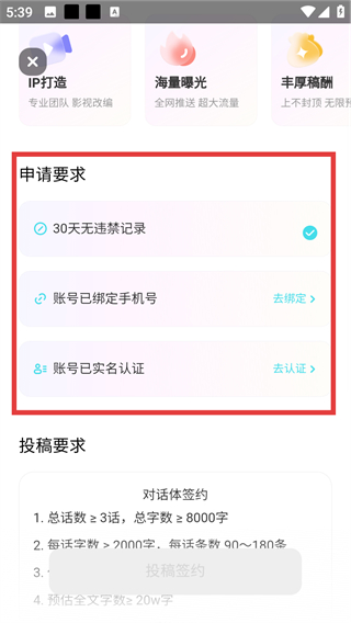 3、在投稿页面看【申请要求】,需满足30天无违禁记录、绑定手机号等条件才能投稿哦。
