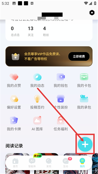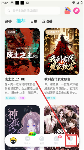 1、在推荐页底部找到【我的】按钮,点击它就能进入个人中心,这里能管理自己的阅读相关内容哦。