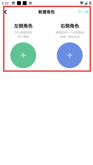 4、进入【新建角色】页面后,可点击左侧绿色加号添加多个角色,右侧蓝色加号添加主角角色哦。
