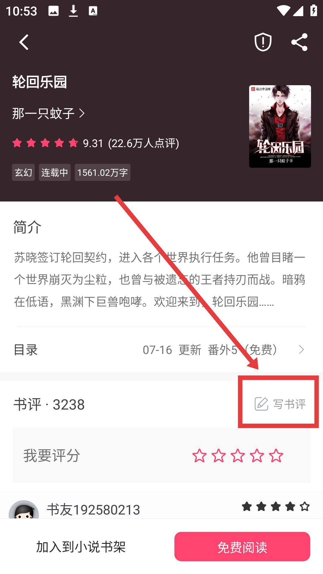 2、进入《轮回乐园》详情页后,点击【写书评】按钮,可参与书评互动啦。