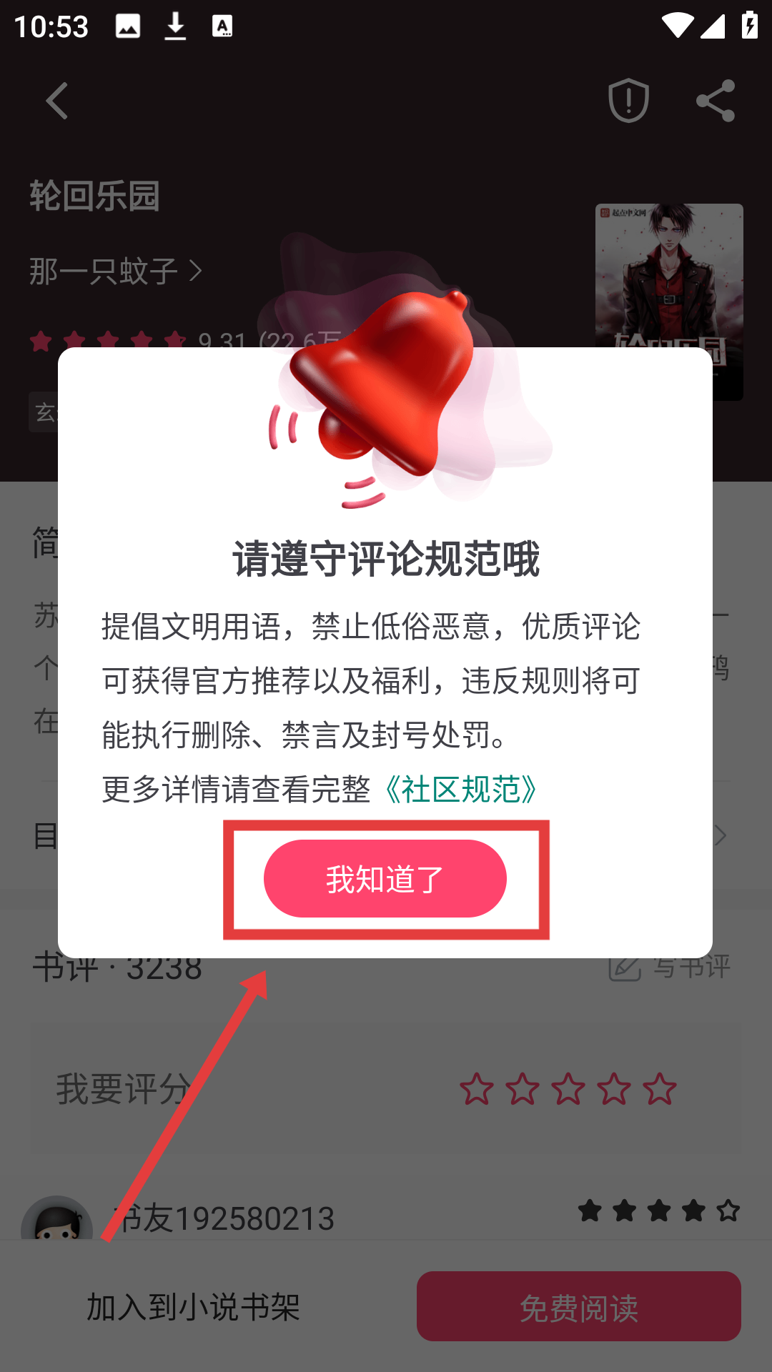 3、点击【我知道了】按钮,确认遵守评论规范,就可以进入书评编辑页面哦。