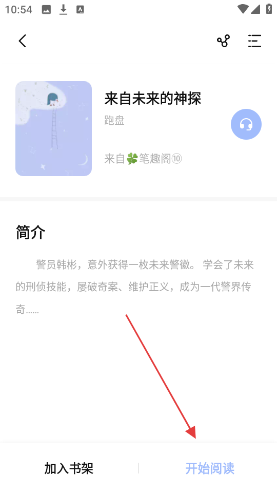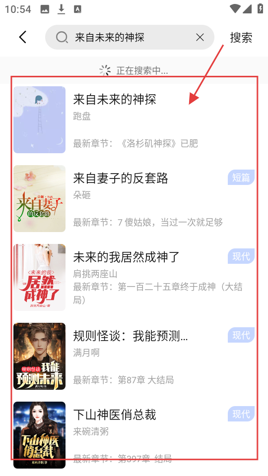 1、搜索【来自未来的神探】,在搜索结果里找到这本小说,点击它就能进入详情页啦。