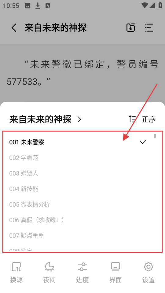 4、打开菜单后能看到章节列表,像【001未来警察】等章节都在这,选择你想读的章节就能直接跳转啦。