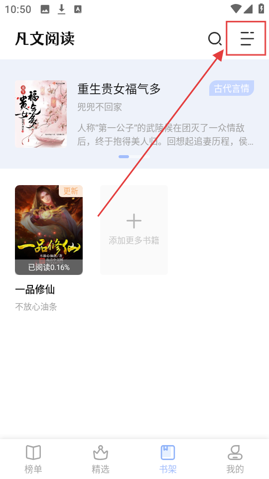 2、进入书架页面后,点击右上角三横线按钮,可弹出功能选项,选择操作功能哦。