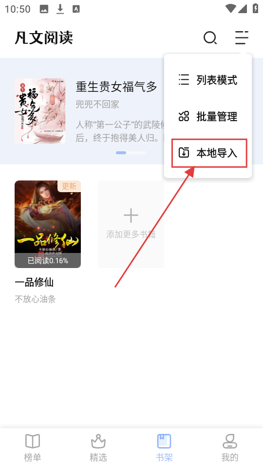 3、在弹出的功能选项中,点击【本地导入】,可进入添加本地页面,准备导入本地书籍啦。
