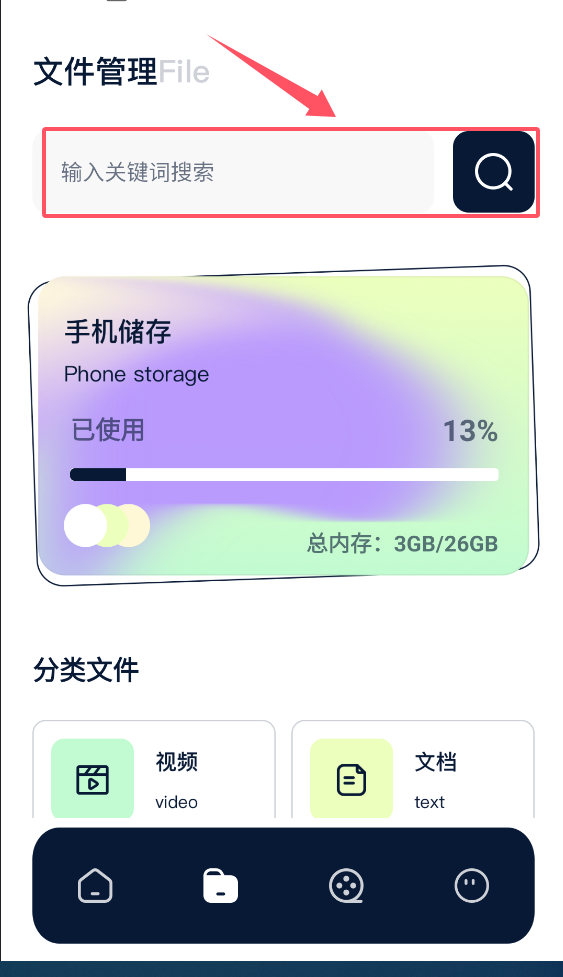 3、分类文件区域有视频、文档等标签,点视频标签就只显示MP4等视频文件。这样按类型查找比翻文件夹更高效,特别是文件较多时。