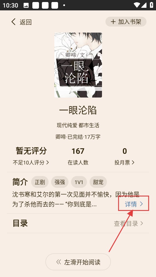 2、进入小说页面后,点【详情】按钮呀,就能查看小说的详细介绍啦。