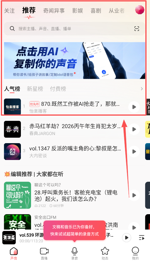 2、探索首页内容蛮简单的,上方可以关注推荐奇闻异事等频道,中间能搜索主播或声音,下方人气榜展示热门播客如怡楽播客。