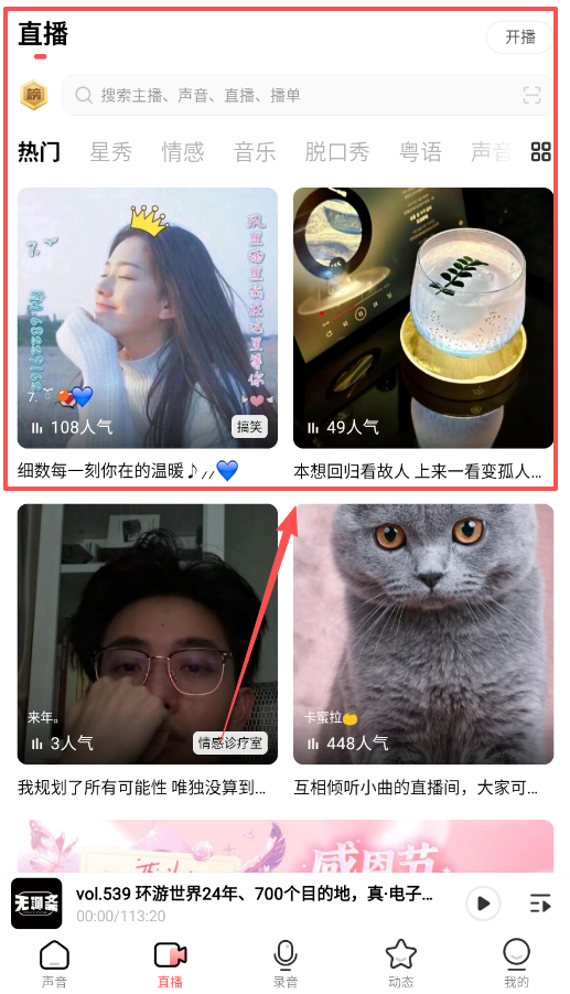 4、尝试直播和录音功能吧,点击底部直播可开播或观看热门星秀情感等直播间,录音功能则有备好的文稿和音乐。