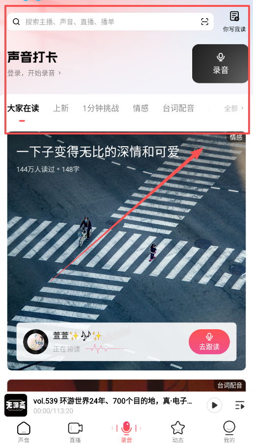 3、参与声音互动很有趣呢,在声音打卡板块,大家可以读上新素材或挑战一分钟配音,看到喜欢的片段如一下子变得无比深情。
