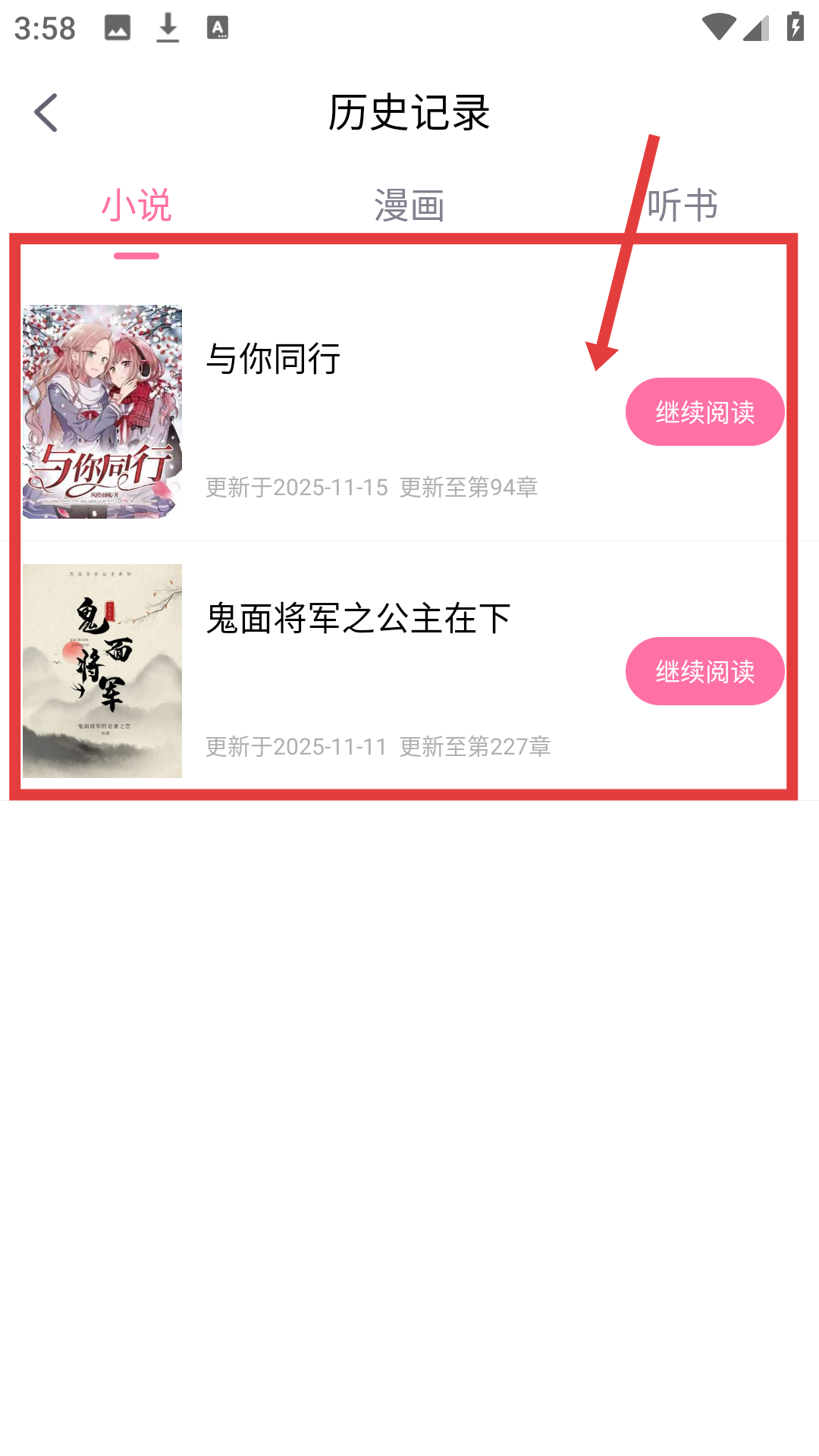 3、在历史记录页面,可看到《与你同行》等小说的阅读记录,准备删除不需要的记录啦。