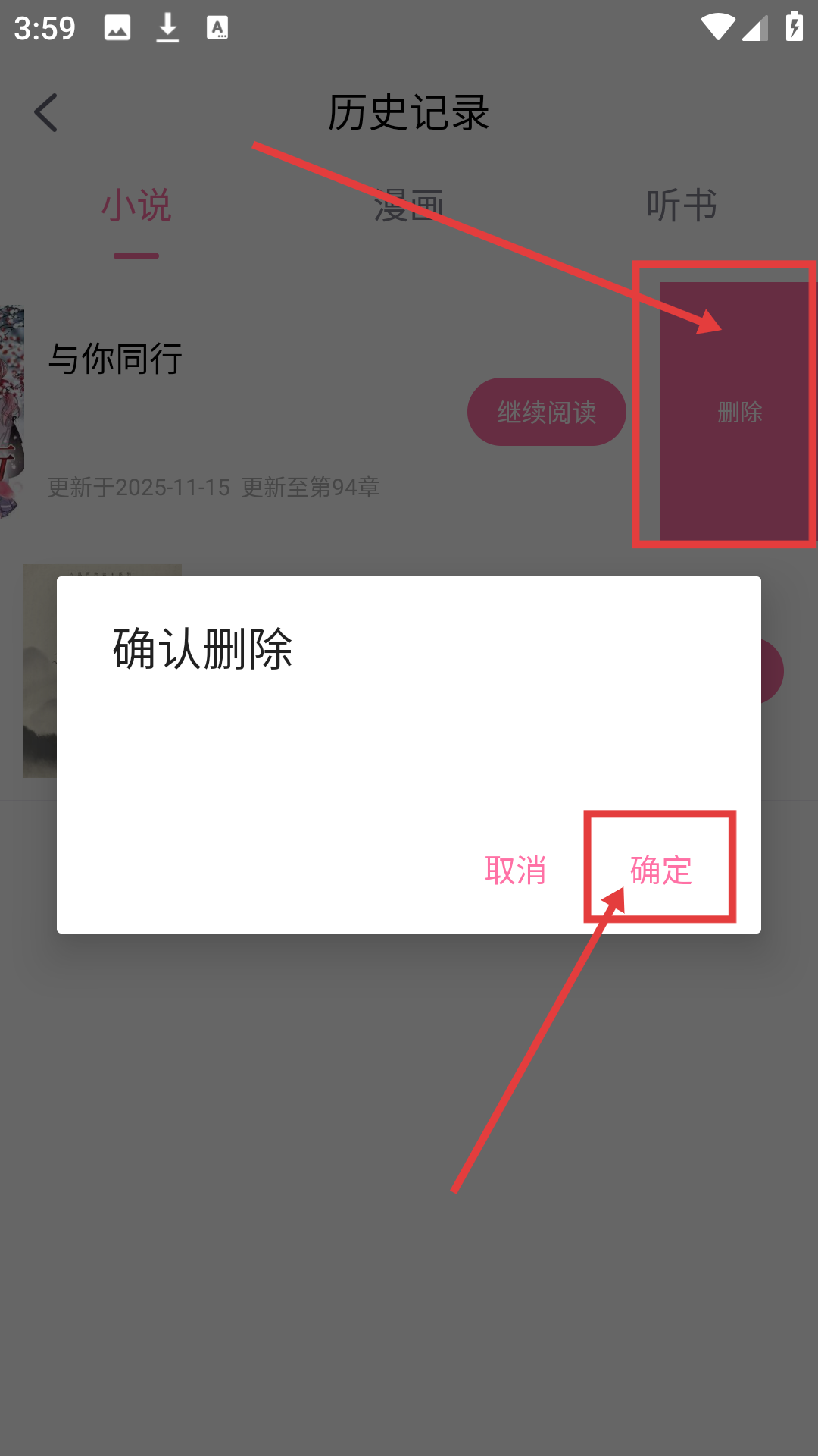 4、选择要删除的阅读记录,点击【删除】后确认【确定】,即可删除该阅读记录哦。