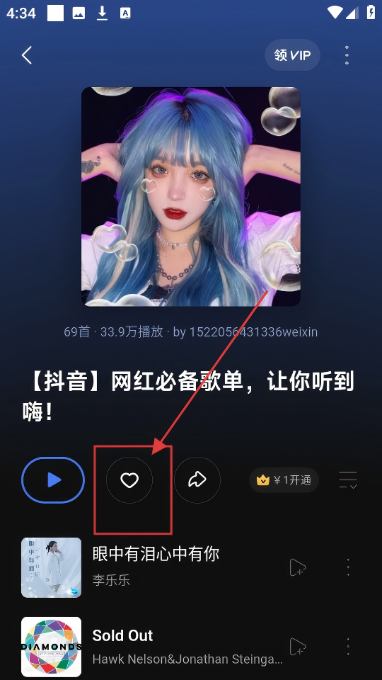 3、进入喜欢的歌单页面,找到心形图标,点击它,就能把歌单加入收藏啦。
