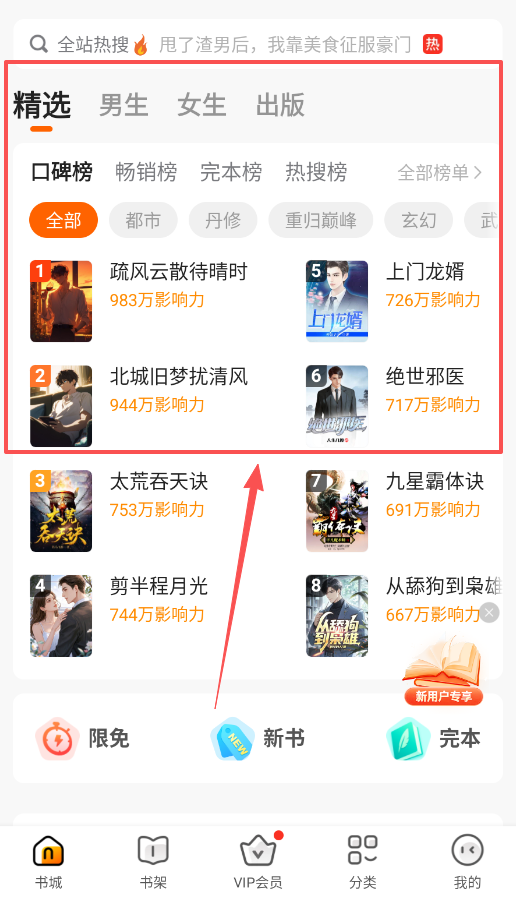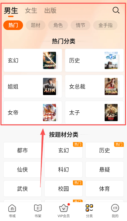 2、探索热门内容,进入书城或分类页面,能看到男生、女生等频道,你可以通过热门、题材等标签快速筛选。