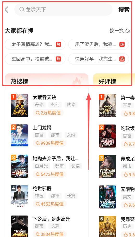 3、利用搜索与榜单,直接点击顶部的搜索图标,你能看到大家都在搜和热搜榜,快速找到流行作品。