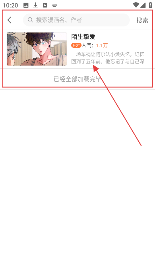3、搜索后找到喜欢的漫画,比如【陌生挚爱】,点击就能进入详情页啦。