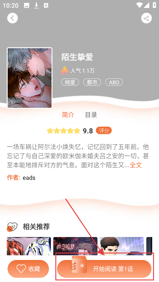 4、进入漫画详情页后,点击【开始阅读第1话】,就能开启漫画阅读之旅啦。